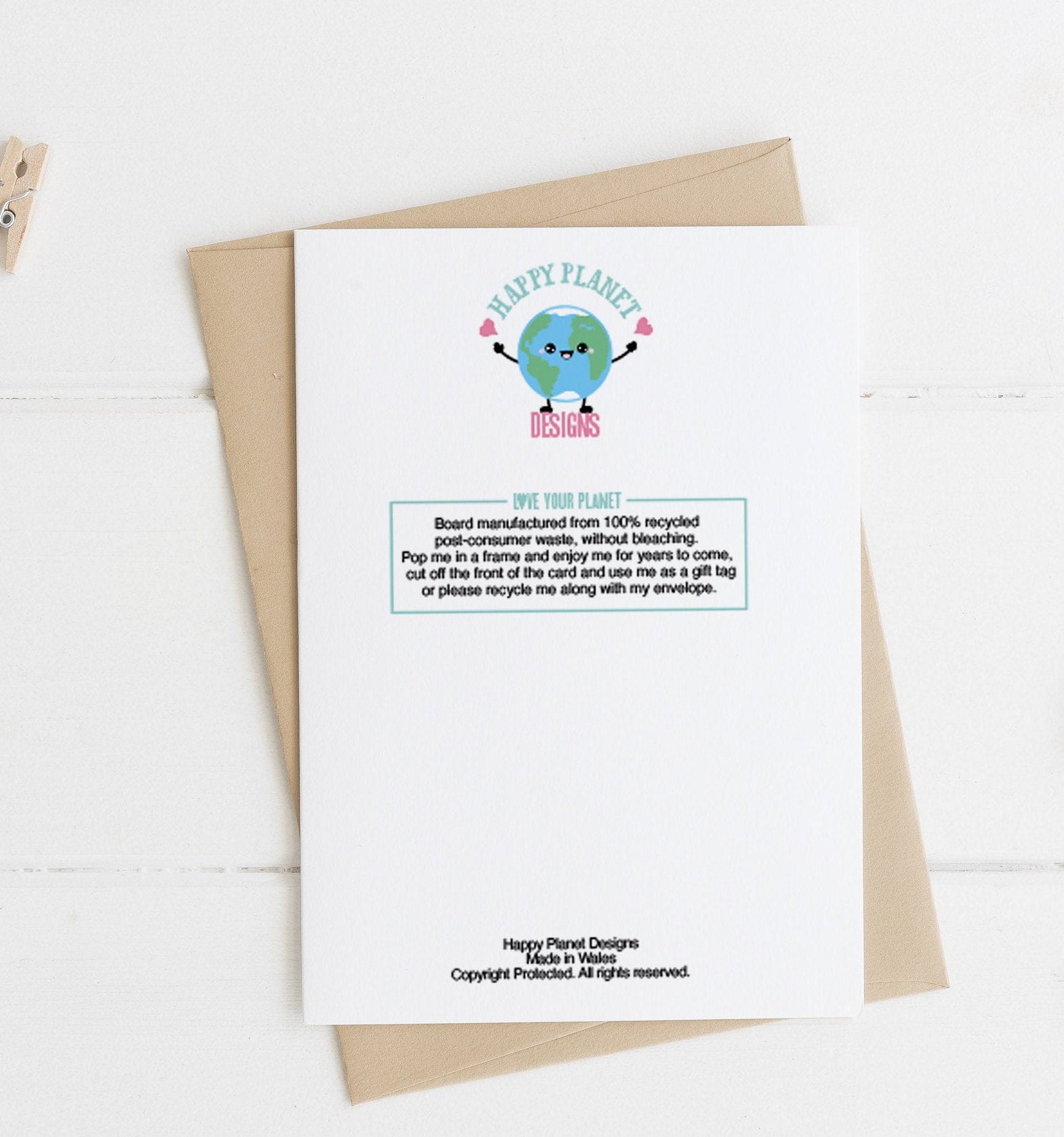 Made from 100% recycled unbleached card, as such it is just a fraction off white with a slight fleck - which adds to its charm- and brown kraft envelope (also recycled) for a happier planet.