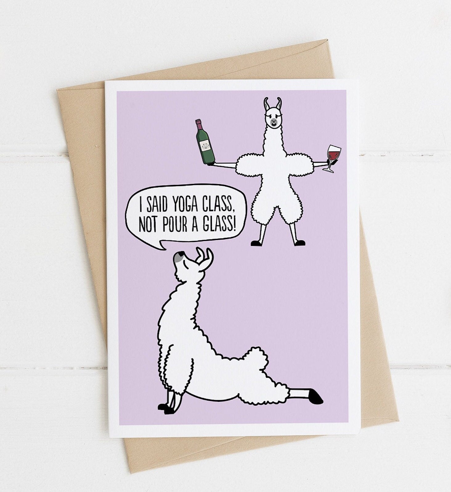 "I said yoga class not pour a glass" says one llama doing Bhujangasana (Cobra pose), as the other llama in the background holds a bottle of red wine in one hoof and a full glass in the other.*