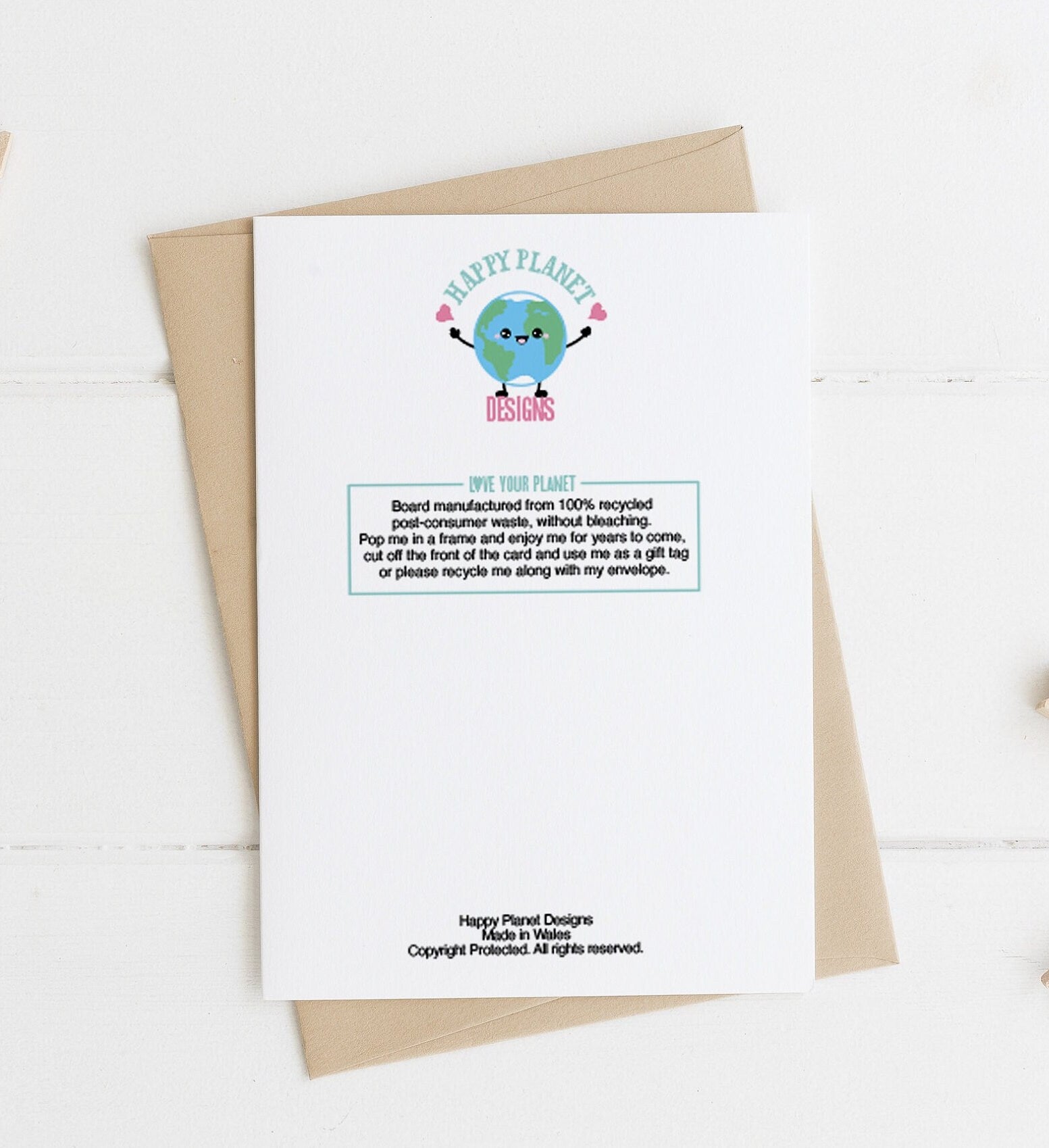 Made from 100% recycled unbleached card, as such it is just a fraction off white with a slight fleck - which adds to its charm- and brown kraft envelope (also recycled) for a happier planet.