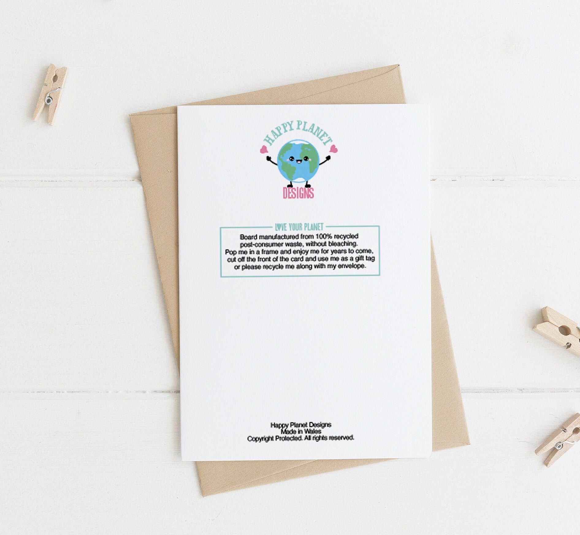Made from 100% recycled unbleached card, as such it is just a fraction off white with a slight fleck - which adds to its charm- and brown kraft envelope (also recycled) for a happier planet.